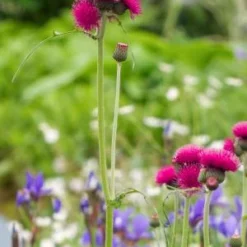 This is a handsome plant which blooms in late spring, producing striking pale blue starlike flowers in clusters at the top of its stems. The foliage looks good all through the year turning vivid yellow in autumn with purple stems, further enhanced by dark dangling pea-like seed pods.
