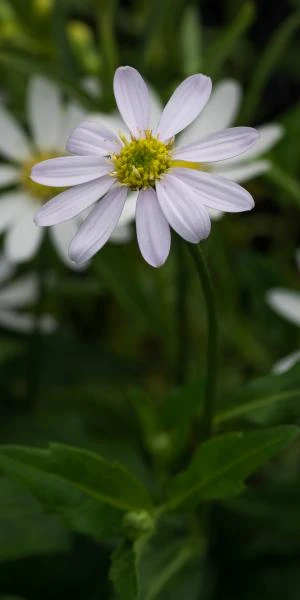 Delicate single palest lilac to white daisy flowers with striking yellow centres are carried on branching stems with fuzzy green foliage.