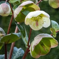 ‘Moondance’ is well named for its white flowers blushed lime green at their centre that will brighten any shadier part of the garden and are often the last flowers to be seen as dusk falls in the late winter and early spring. This ethereal look is further enhanced by the silvery veining and marbling to its neat leathery evergreen foliage, providing year round interest in the garden.