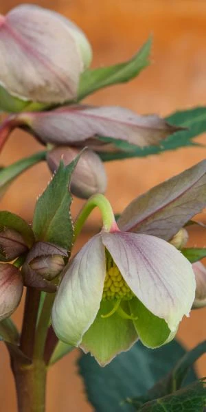 Well named for its very attractive evergreen foliage, leathery silver-grey serrated leaves with pale green veining and flushed red undersides, the flowers that emerge in midwinter are equally striking. Held in small clusters above the architectural leaves, its simple elegant cup-like flowers are palest green with dusky pink reverse.
