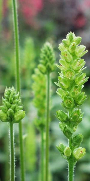 ‘Greenfinch’ produces masses of upright flower spikes during summer, each with a cluster of green tubular flowers. These imposing blooms are very popular with flower arrangers. Unusually the foliage of this Heuchera plays second fiddle to the flower, forming a low mound of evergreen, shallowly lobed green leaves.